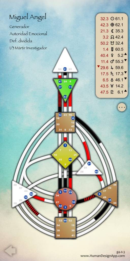 Una vez instalados en lo que sería nuestro hogar, Nuria Emociones nos introdujo en el arte del Diseño Humano. Días anteriores nos había pedido hora, fecha y lugar de nacimiento y, con estos datos, nos había preparado una ficha personalizada. ¿Que cómo es el aura del Generador? Envolvente, acogedora. Su única protección es su estrategia que consiste en responder momento a momento. Les (nos) cuesta parar porque son máquinas de energía, aunque corren el peligro de que se aprovechen de ella. Han de escuchar a su sacral, aunque los sociedad no les guste, y si la respuesta es correcta, acceden a la energía vital. Si no, se agotan. A parte de los Generadores Puros o Manifestantes, estarían los Manifestantes, los Proyectores y los Reflectores.