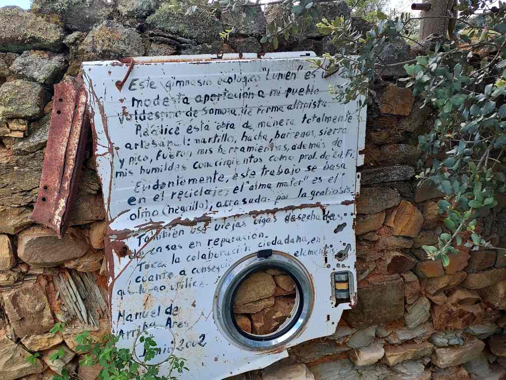 Por el camino, apetecía, nos entretuvimos un poco para hacer ejercicio en el Gimnasio ecológico Lumen, en Valdespino de Somoza. De manera artesanal, este profesor de educación física -Manuel de Arribas Ares- usa el reciclaje, siendo, como él dice, el «alma mater» el olmo (negrillo). Los aparatos, los probamos todos, funcionan de maravilla.